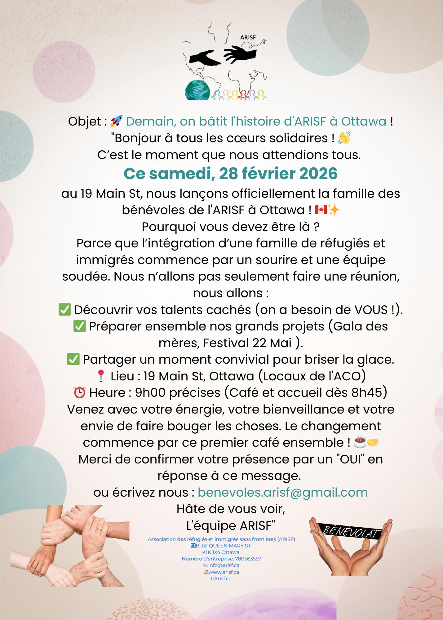 24 February 2026 Le début d’une communauté solidaire à Ottawa Posted by adminCategory: news Le début d’une communauté solidaire à Ottawa Prénom *Nom *Numéro de téléphone *Adresse e-mail *Langues parlées: *FrançaisAnglaisAutreVos Talents & Compétences (Cochez ce qui vous correspond)(Cochez ce qui vous correspond)Logistique : Transport, installation, manutention.Communication : Réseaux sociaux, photo, vidéo, rédaction.Accueil : Écoute, traduction, orientation des réfugiés.Événementiel : Cuisine, décoration, animation, technique.Administratif : Saisie de données, appels, recherche.Disponibilités *Semaine (soir)Fin de semaine (samedi/dimanche)Projets Coups de Cœur (2026) *Activité "Strong Women" (Mars)Gala "L’Éclat des Mères" (22 Mai)Grand Festival ARISF (Juin)Comment avez-vous connu l'ARISF? * Visual Text 0 / 180Envoyer la demande Partenaires